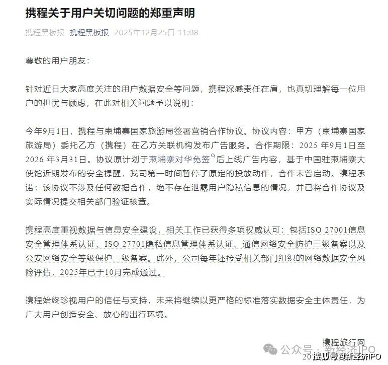 在这份并不算长、却被反复转发的声明中,携程表达了几个主要观点:首先,携程承认今年9月1日与柬埔寨国家旅游局签署了营销合作协议,合作周期覆盖2025年9月至2026年3月;其次,该合作属于广告与营销层面的委托,“不涉及任何用户数据合作”;最后,基于中国驻柬埔寨大使馆近期发布的安全提醒,原计划中的相关投放已经暂停,“合作未曾正式启动”。携程还在声明中强调,公司已通过ISO 27001、ISO 27701等多项信息安全与隐私保护认证,并已将协议提交有关部门核查。