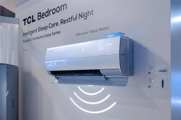不止于屏显年度新品,TCL实业更带来融合全面AI科技的全场景新品。在空调领域,TCL实业以AI健康技术定义新一代空调。本次展出的TCL小蓝翼C7 AI健康空调主打“AI睡眠”功能,拥有行业首创可变睡眠温度曲线,采用全球首创毫米波雷达感知技术,识别人体体动状态,并配合AI遗传算法,提升深睡时长25%;同时搭载四重降噪系统,实现16分贝静音新风,营造高质量睡眠环境。AI语音功能上,TCL小蓝翼C7 AI健康空调通过自研伏羲语音大模型,支持离线在线双模式自由对话,融合Deepseek伏羲语音大模型,查询天气、播放音乐等各种需求也能轻松应对。此外,搭载超省电AI大数据模型算法2.0,制冷制热都省电,至高省电40%。
