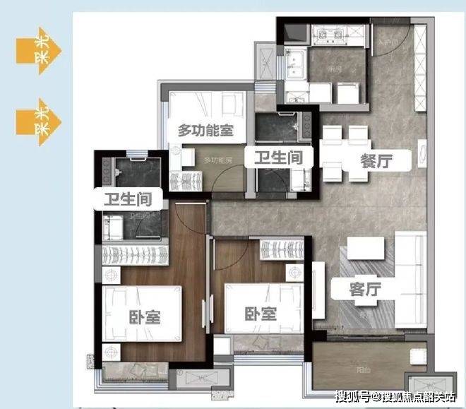 86㎡方正三房,是投资精品上车的首选户型。L 型飘窗设计独具匠心,不仅增加了室内采光面,还让主人房视野最大化,居住者可以欣赏到窗外更广阔的风景。同时,该户型超高使用率,布局合理,各个功能区划分明确,动静分区合理,活动区与休息区互不干扰。客厅、餐厅与卧室的空间尺度适宜,能满足日常生活的各种需求。对于预算有限但又想在广佛热门区域投资房产的购房者来说,这款户型以其较高的性价比和良好的居住体验,具有较大的吸引力。